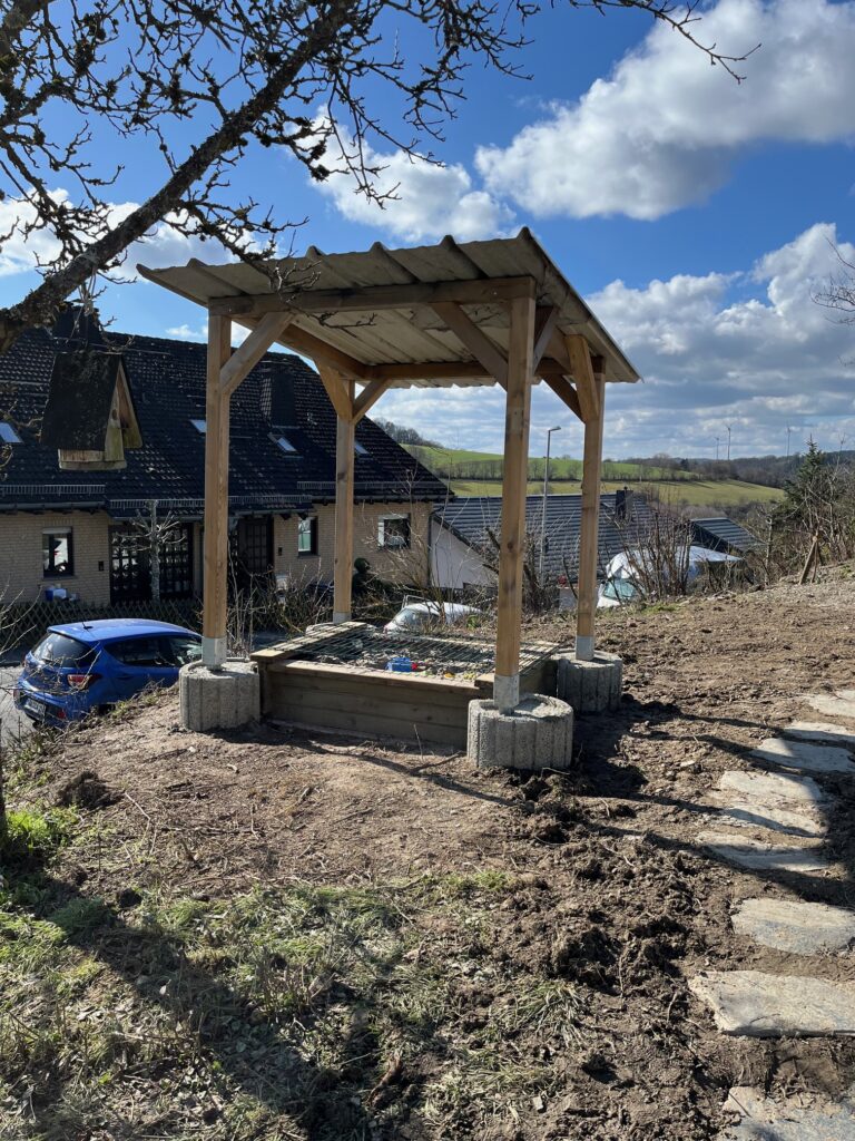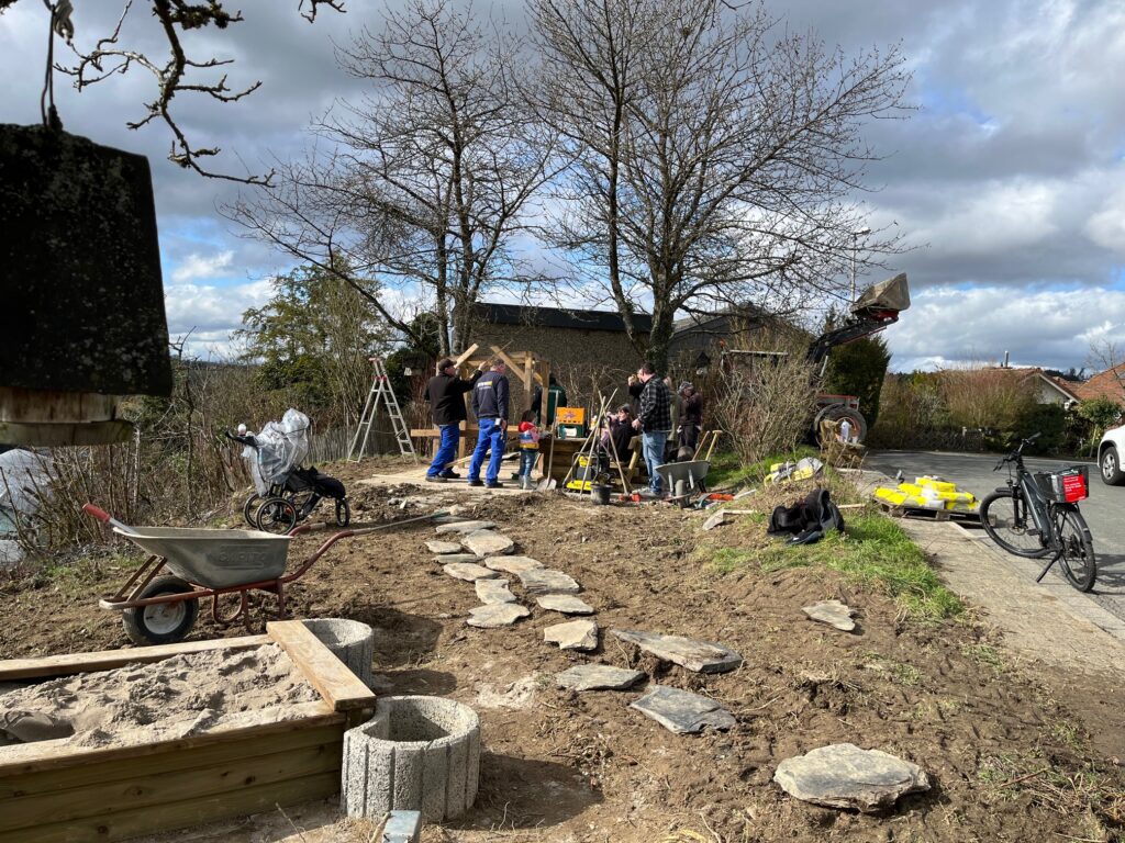 Nachdem die Zustimmung des Bad Schwalbacher Magistrats vorlag, konnte gestartet werden. In ca. 140 Arbeitsstunden an mehreren Tageseinsätzen wurde das Areal von Gehölz und Wurzelwerk befreit, die Fläche geebnet, der Sitzbereich und der Untergrund für den Sandkasten gepflastert, ein Sonnenschutz für den Sandkasten montiert und aufgestellt, die Zuwegung von der Straße mit den von dem früheren Sitzplatz noch vorhandeneren Schieferplatten ausgelegt, und, und, und ….